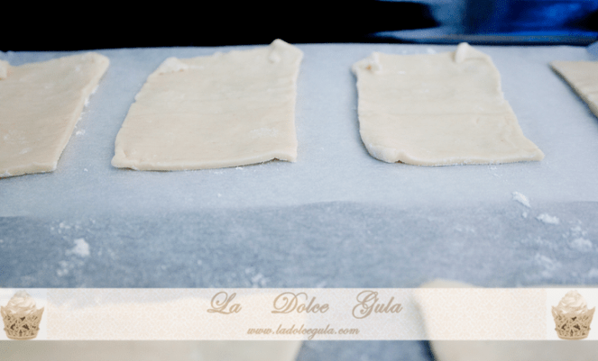 Precalentamos el horno a 180º.  Enhariamos la mesa de trabajo y ponemos el hojaldre para cortarlo en retángulos lo más similares posibles.Se colocan en la bandeja de horno forrada de papel vegetal y los tapamos también con otro papel vegetal. Se hornean durante unos 12-15 minutos aproximadamente,que no quede muy seco el hojaldre.