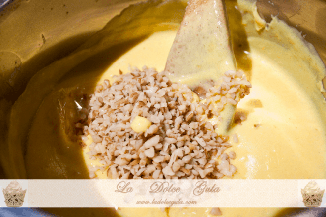 Ponemos la mezcla al fuego para que cueza suave,seguimos removiendo con la cuchara de madera para no formar grumos. Una vez calentado,añadimos las nueces (o avellanas) picadas,se mezcla y se deja enfriar.