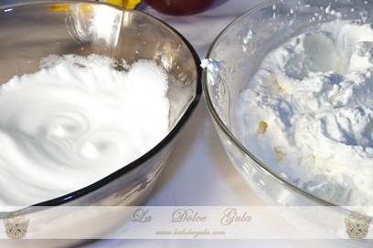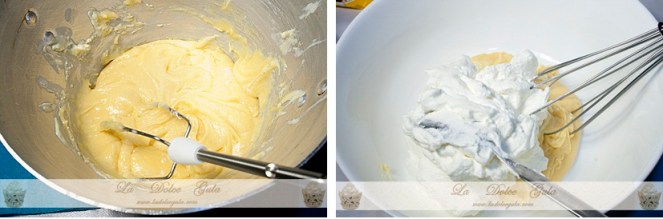 Se separan las yemas y claras. Se montan las claras a punto de nieve con una pizca de sal.Por otro lado,se bate también la nata a punto de nieve y se reserva en la nevera.