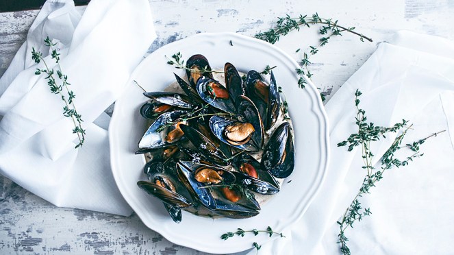 4. Añadimos los mejillones, damos un par de vueltas y servimos acompañados de unas ramitas más de tomillo fresco.