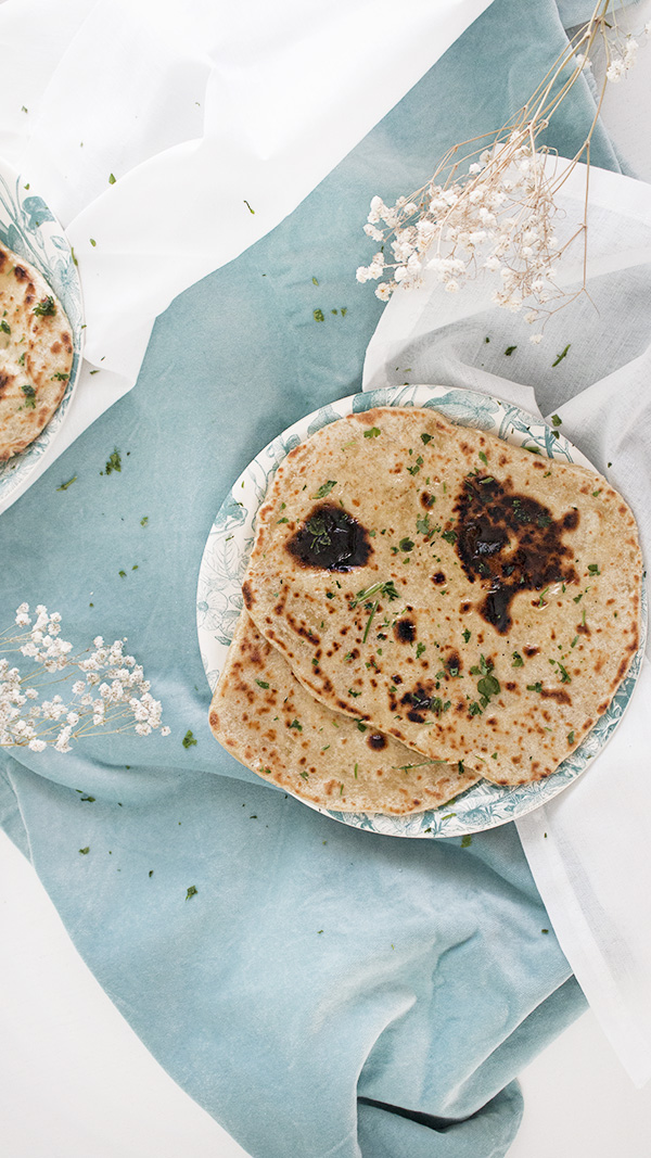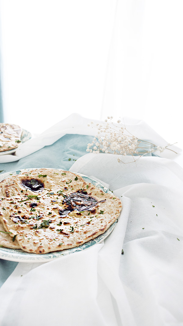 5. Calentamos una sartén y cocinamos nuestros naan. A fuego medio alto, les damos la vuelta cuando empiecen a hacer burbujas y luzcan dorados. Los tapamos mientras cocinamos el resto.