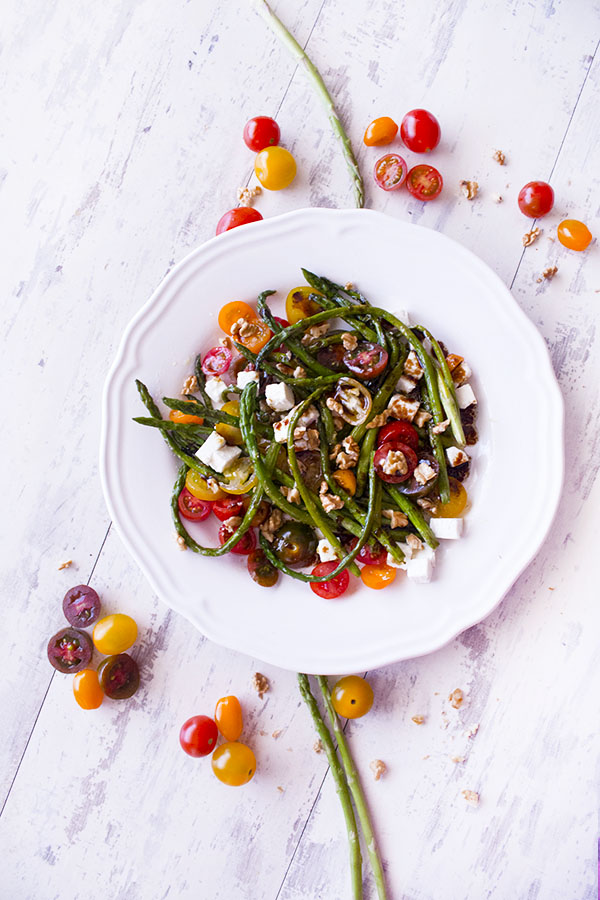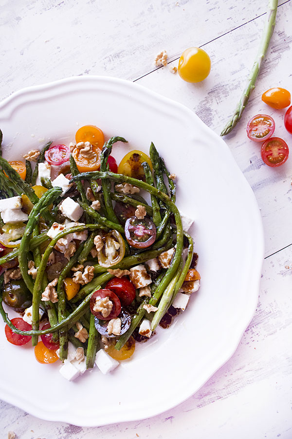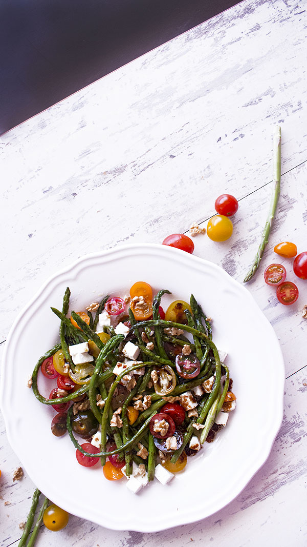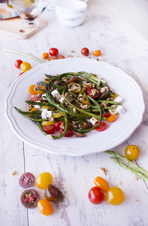 4. En un plato o bandeja colocamos los espárragos, los tomates en rodajas, el queso feta, el aliño y por último las nueces en trocitos. Mezclamos todo bien y servimos.