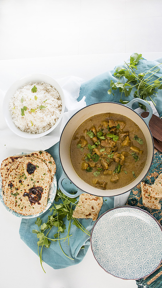 5. Servimos el cordero adornado con cilantro fresco picado y acompañado de arroz basmati y pan naan casero untado con mantequilla y espolvoreado con perejil.