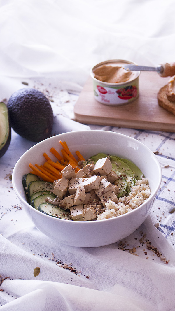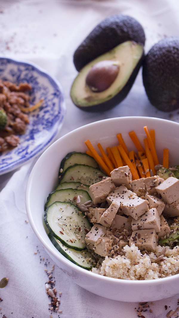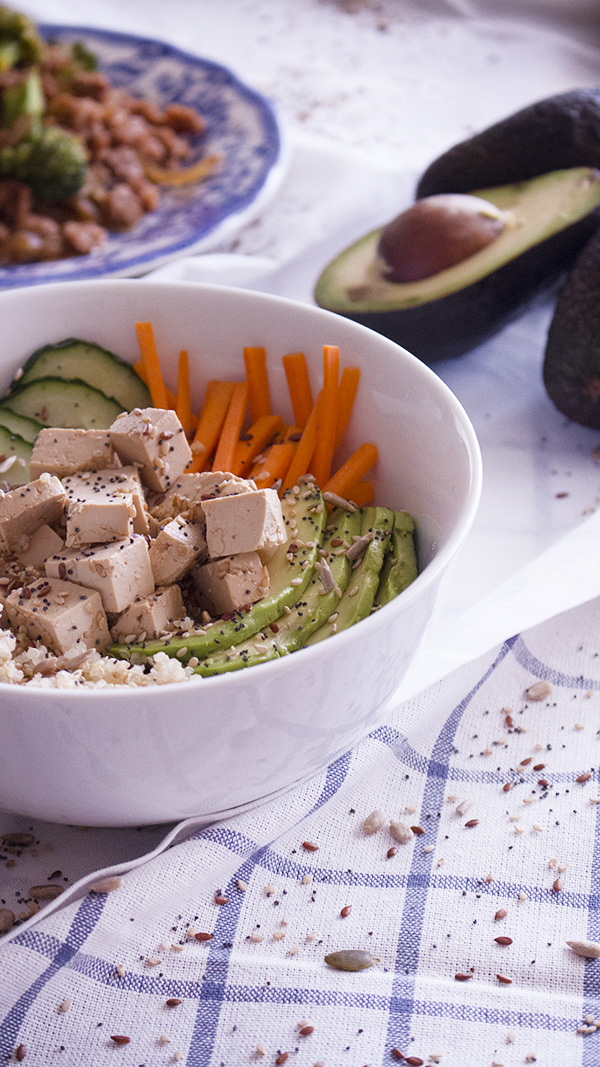La receta que os traigo hoy es un “must”, por lo menos en la capital, desde hace unos meses. Los más enteradillos sabréis lo mucho que están de moda los poke bowls: esa especie de plato combinado asiático healthy que es un equilibrio perfecto. Yo he preparado mi versión vegana con tofu y quinoa y en villa dolce nos ha gustado bastante el resultado. Y hablando de quinoa, os recomiendo este otro plato que preparamos con ella y que es muy TOP.