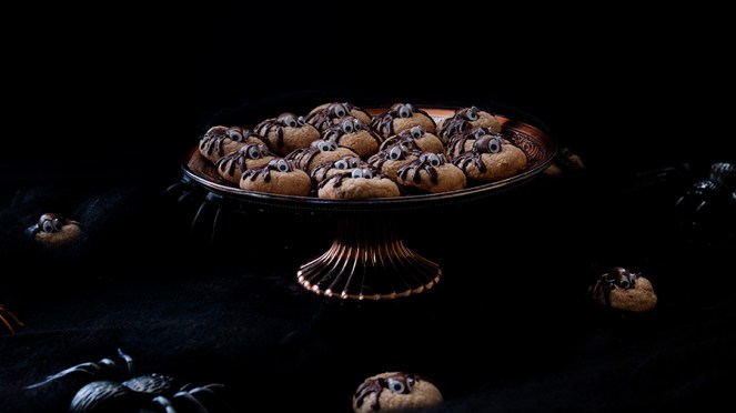 Para acompañar en la mesa de hoy a la pumpkin cake del otro día, estas deliciosas mini galletitas de arañitas con Conguitos que hemos preparado con la Degustabox de este mes.
