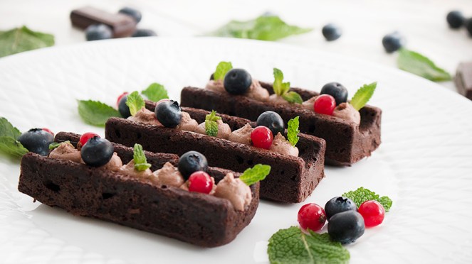 10. Emplatamos los bizcochitos, decoramos con la crema, la menta y las frutas. Servimos.