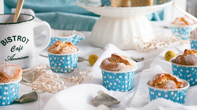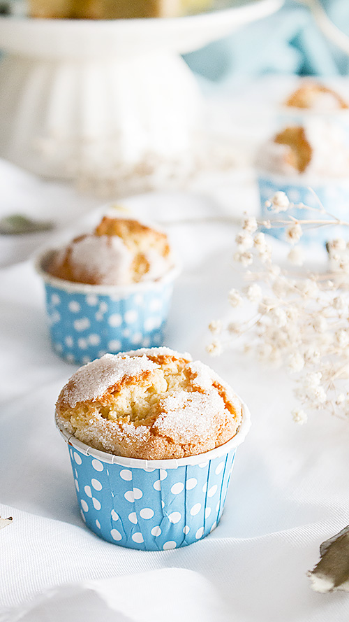 6. Repartimos la masa en los moldes y dejamos reposar en la nevera unos 15 minutos. Después, sacamos de la nevera, espolvoreamos con azúcar por encima nuestras magdalenas generosamente y horneamos a 200º durante unos 12/15 minutos o hasta que veamos que han subido y están doraditas.