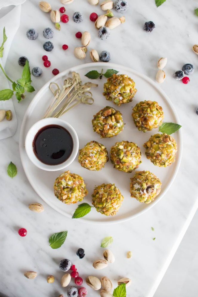 3. Hacemos bolitas con la mezcla de quesos y las rebozamos en el bol de pistachos picados.