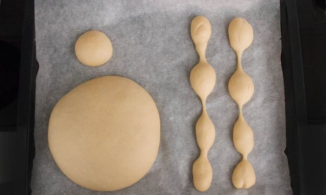 4. Forramos la bandeja del horno con papel vegetal. Con la parte grande de la masa formamos nuestro bollo, lo boleamos y damos forma y dejamos en la bandeja. Cogemos de la parte de la masa para decorar 60 g. Formamos una bolita con ella y colocamos también en la bandeja del horno. Dividimos el resto de la masa para decorar en dos (70 g. cada una). Formamos las tiras que cruzarán nuestro bollo estirando la masa y dejando unos lados más finos con ayuda de los dedos, debéis de darle la forma que se ve en la foto.