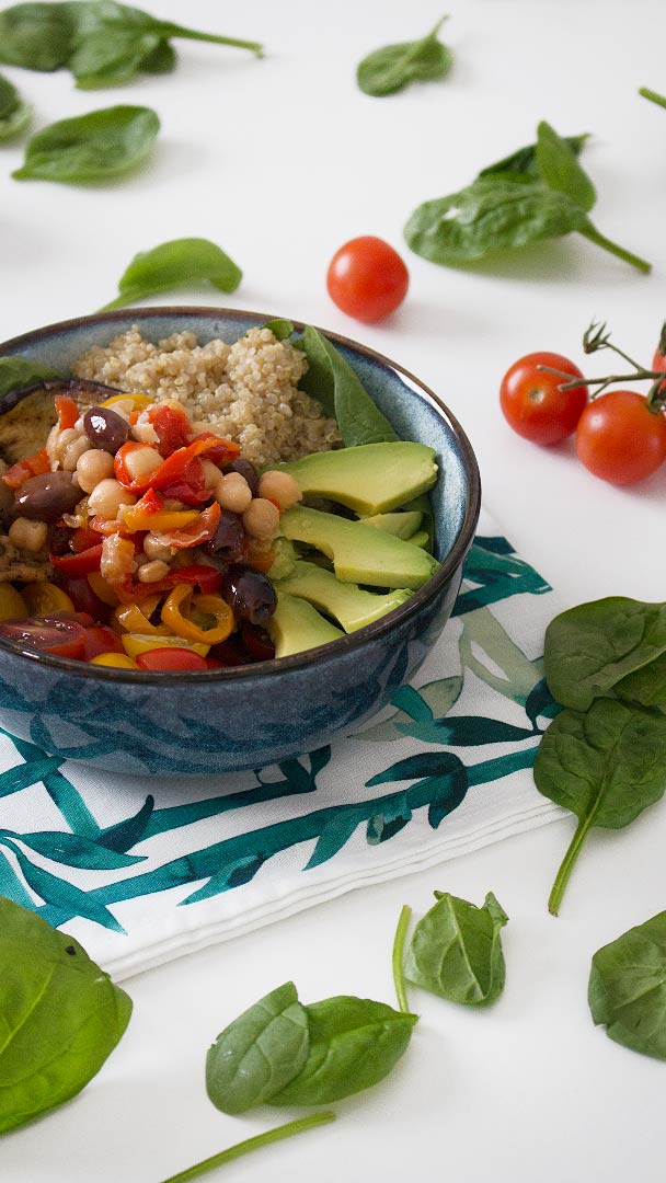 3. En el fondo del bol ponemos las espinacas baby, agregamos la quinoa, los tomates cherrys cortados por la mitad, las rodajas de berenjena, el aguacate cortado,  y por último al centro la mezcla de garbanzos y pimiento. Aliñamos con el jugo de los garbanzos y si queremos añadimos un poco más de aceite y limón.