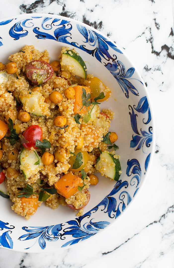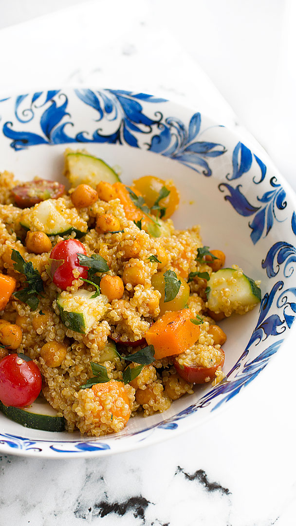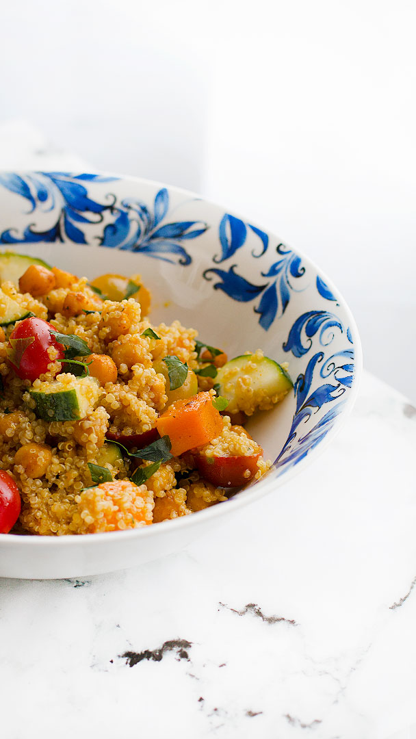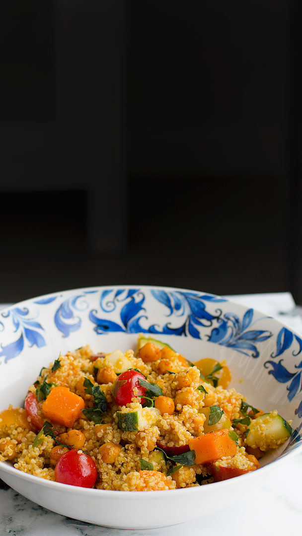4. En un bol grande, agregamos los garbanzos, la calabaza, la quinoa y el resto de ingredientes. Mezclamos y por último incorporamos el aliño. Lo integramos bien y servimos o tapamos y guardamos en la nevera.