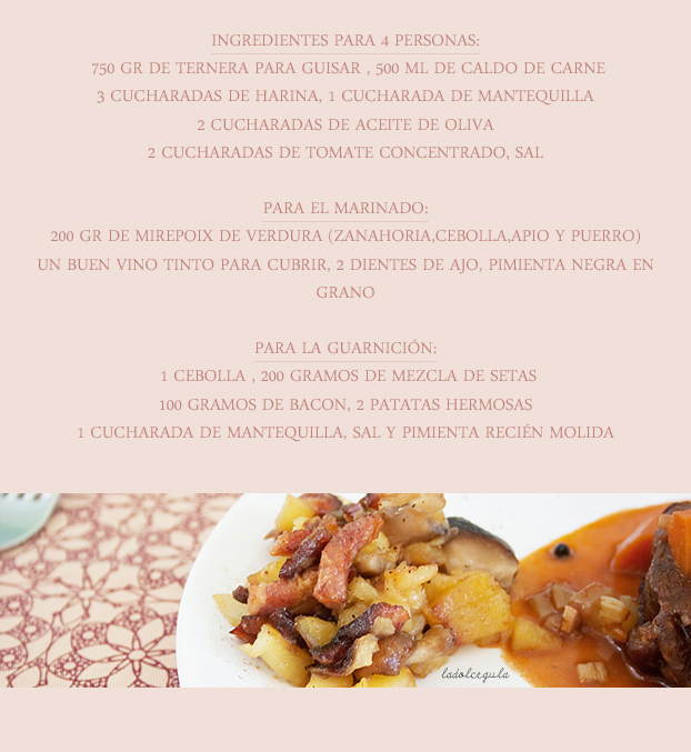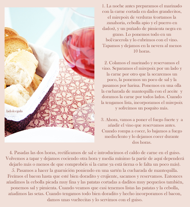 Mirando en el de cocina clásica francesa me topé con un estofadito de carne de lo más tradicional y apetecible (mira que me gusta a mí un buen plato a fuego lento). La famosa receta de BOEUF BOURGUIGNON, espectacular. Yo varié un poco la guarnición original y como buen guiso, está mejor de un día para otro, palabrita.