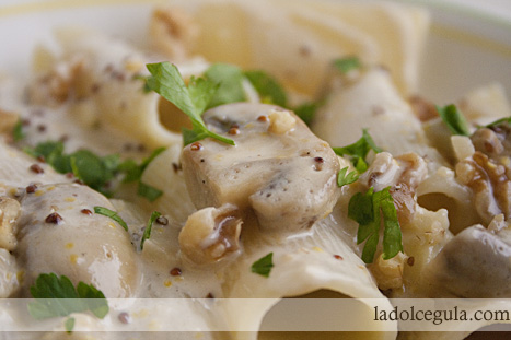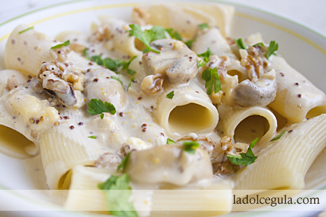 Preparé el Sábado Rigatoni tamaño XXL con esta salsa en la que el cremoso queso Brie ,la textura de las nueces y el potente sabor de la mostaza cogen toda la fuerza y nos llevan a otros paladares exclusivos y menos acostumbrados ,y que el común y eficaz champiñón y el verdoso y tierno perejil nos trae de vuelta a la mesa.