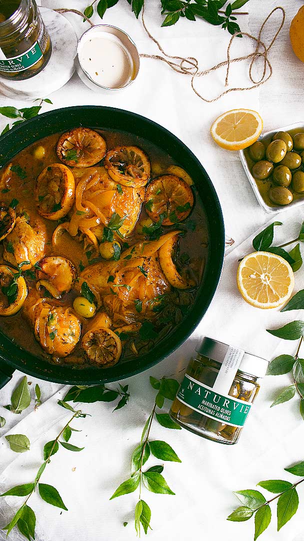 Para realizar esta maravilla de pollo al limón estilo marroquí he utilizado las aceitunas aliñadas de Naturvie que terminan de completar este plato redondo.