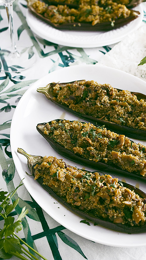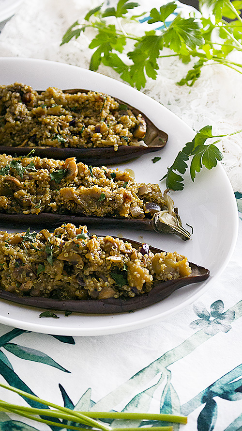 5. Mezclamos con la quinoa los tomates asados y los piñones. Rellenamos las berenjenas.