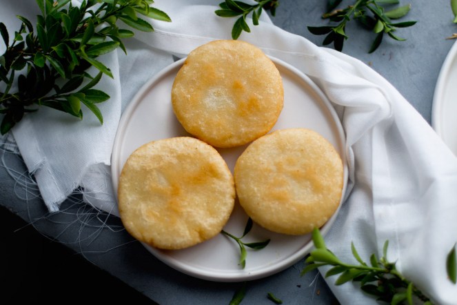 4. Calentamos una sartén con abundante aceite vegetal, mientras formamos las arepas cogiendo pequeñas porciones de masa. Hacemos una bola con ella, aplanamos y redondeamos.