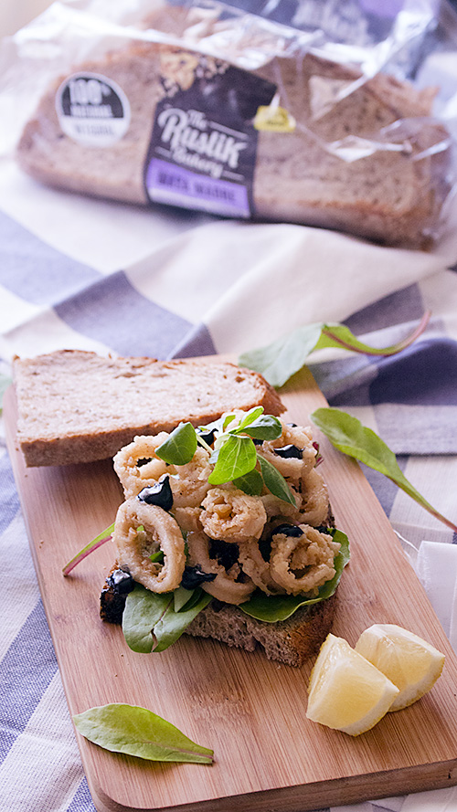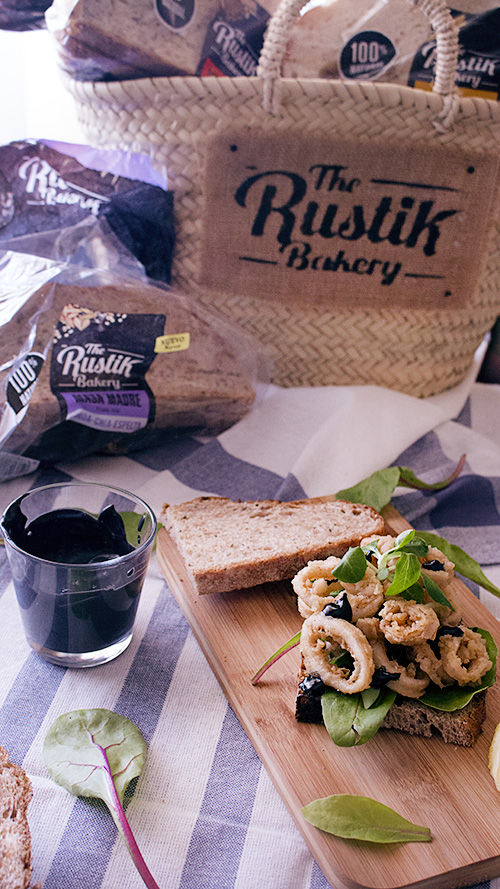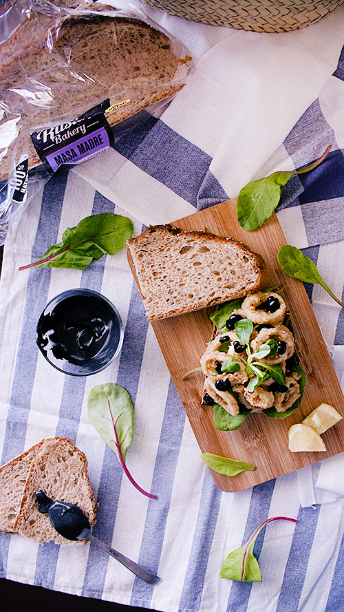 Hoy me he decantado por el pan de quinoa, chia y espelta para este sandwich de calamares con alioli de tinta de calamar.